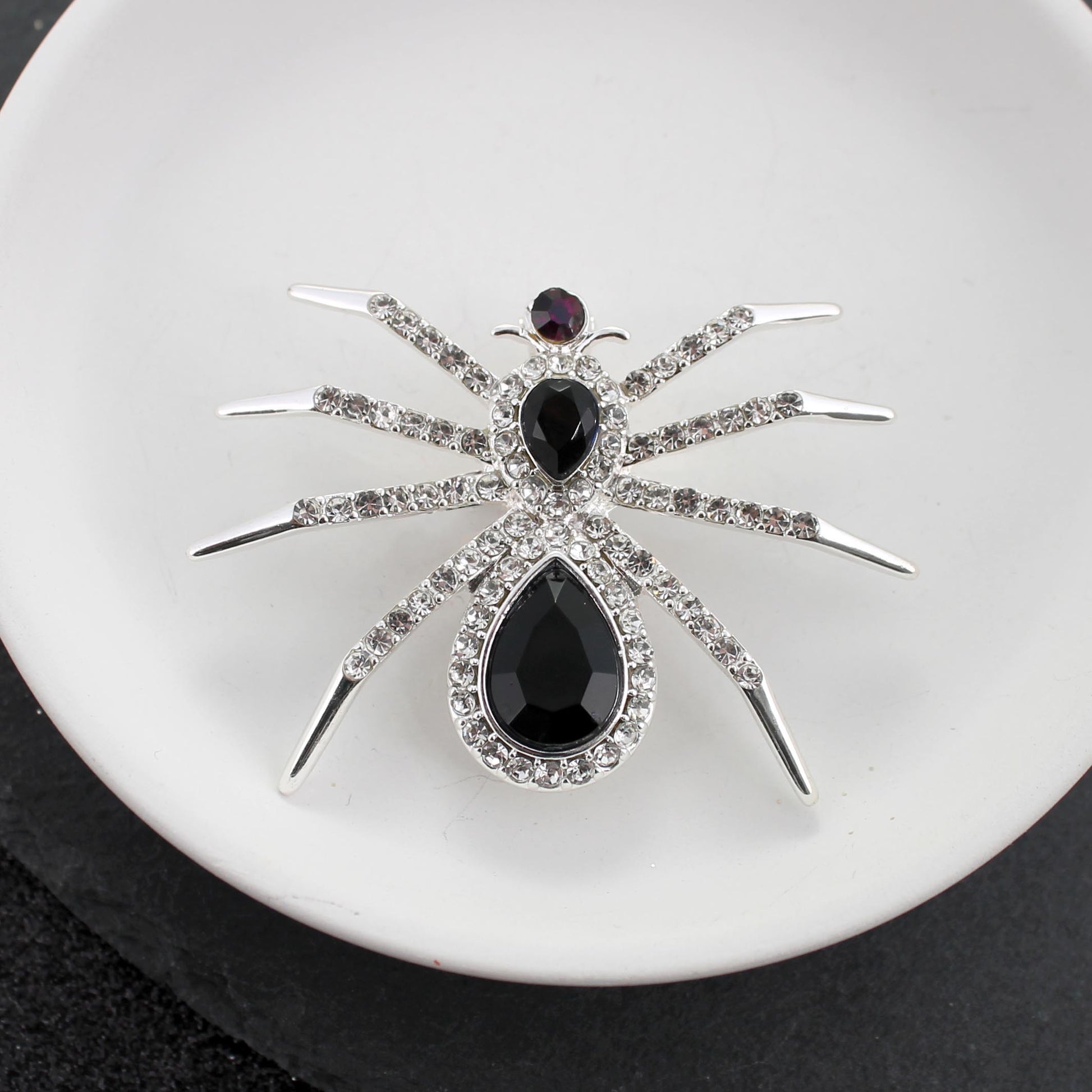 Silver tone magnetic clasp pin/pendant featuring a crystal spider design with black teardrop crystal accents. Perfect for Halloween! Spider measures 2.25” in width.