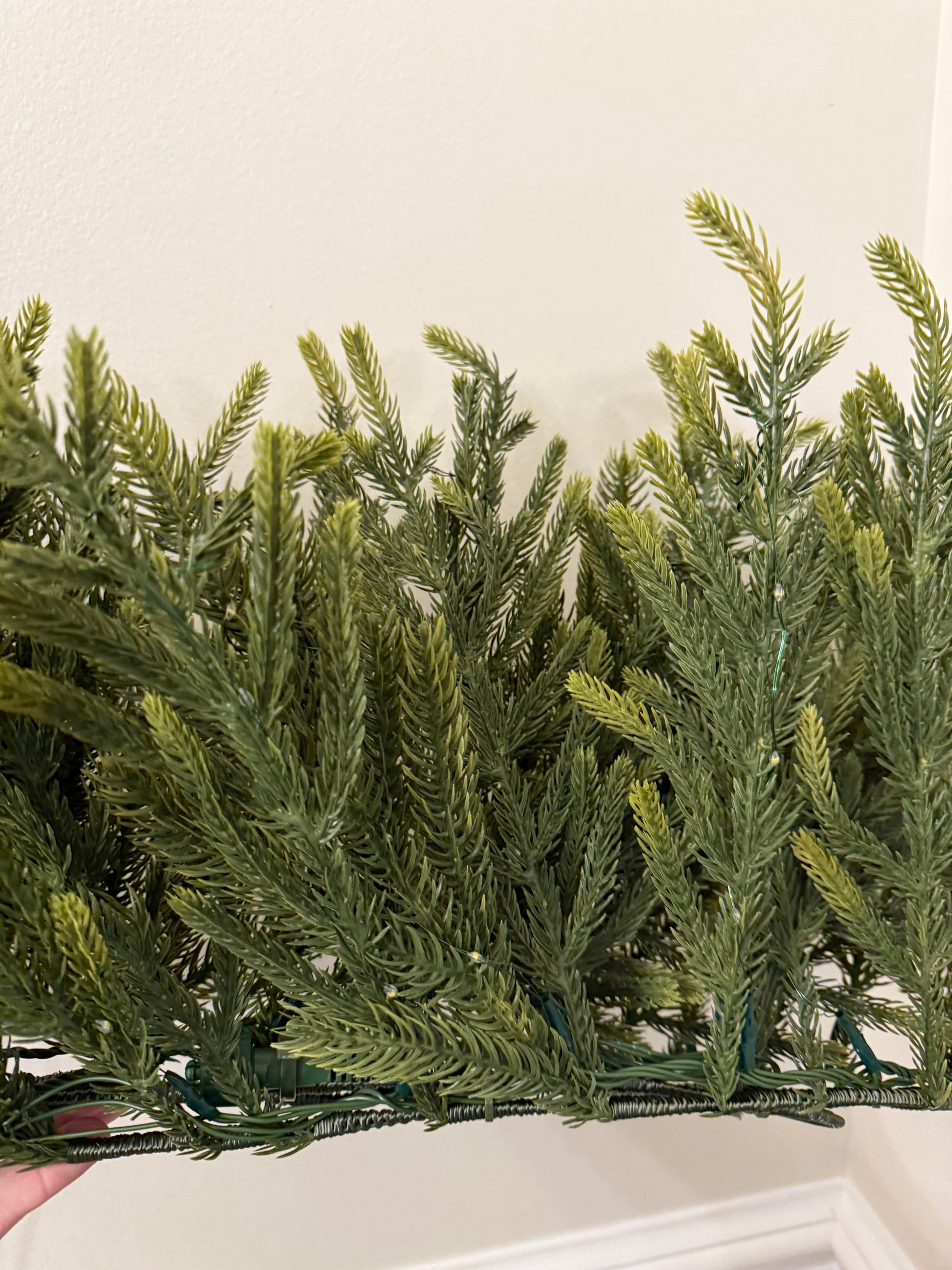 6’ by 18” Real touch Norfolk garland with warm white fairy lights.