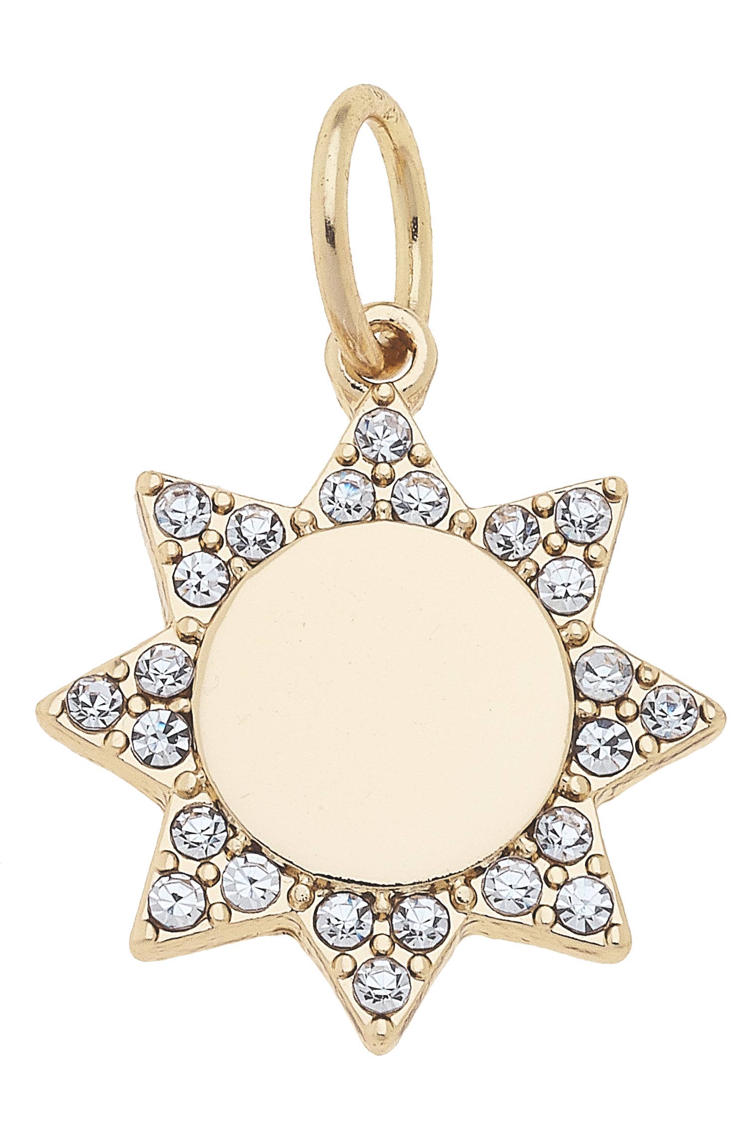 The Pave Sun Charm in Shiny Gold features a sun design covered in pave stones for added sparkle. This charm symbolizes warmth and positivity, making it a bright addition to your jewelry.
